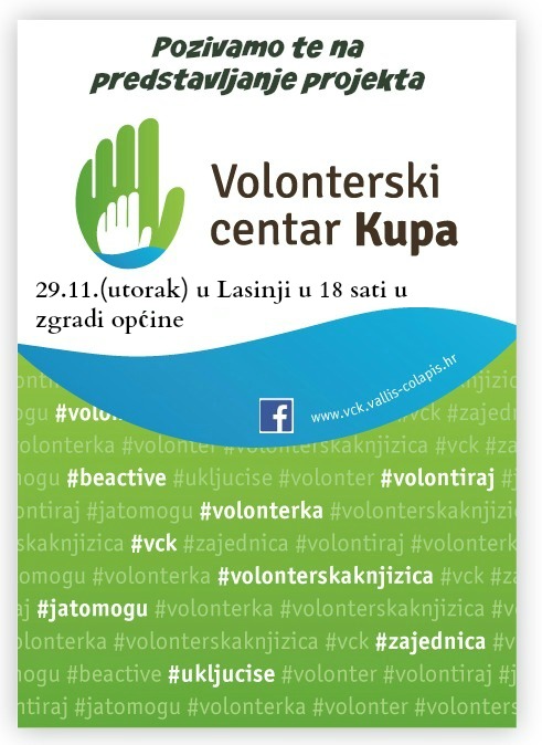 Općina Lasinja i Volonterski centar Kupa pozivaju volontere, organizatore volontiranja, udruge, javne ustanove i sve ostale zainteresirane na predstavljanje projekta "Volonterski centar Kupa" u Lasinji 29. studenog 2016. godine, u 18 sati u zgradi općine, Lasinja, Lasinjska cesta 19.
